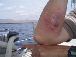Par contre, le captain allait faire une bêtise qui aurait pu avoir des conséquences plus sérieuses; alors qu'il n'arrête pas de mettre en garde tous les équipiers occasionnels du bateau sur le danger des winchs électriques des écoutes de génois, il commit une erreur impardonnable : observant la forme du génois appuyé sur le winch tribord, il eut la bonne idée d'actionner ce dernier! Résultat, la peau du bras fut happée par le winch, et il ne pût s'en dégager qu'en démontant la partie supérieure de ce dernier. Il en fut qitte pour quelques lambeaux de peau arrachés et de belles ecchymoses.
