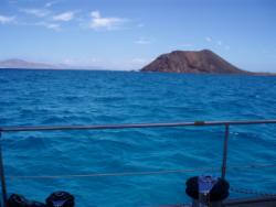 Après le plein de gasoil (à 0,85 € le litre!!), nous quittons la marina Rubicon à 11h45 par vent de nord-est, force 4 à 5; nous avançons entre 8 et 9 nœuds sur une mer belle, bref, le pied parfait en terme de voile; même Maryse prend le sien! En arrivant sur la côte de Fuerteventura, nous passerons entre celle-ci et la petite île de Lobos, dans un chenal peu profond et avec une couleur de l'eau laissant déjà deviner ce qui nous attend dans les lagons antillais ou polynésiens!