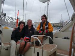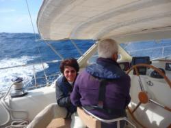 Sur le plan vélique, ce fut un régal : vent de travers force 6 puis 7, avec rafales à 35 nœuds, mer de travers également, le bateau, bien réglé (génois et grand voile partiellement roulés), taillait sa route à 9 nœuds dans des creux de 4 à 5 mètres. Sur le plan de la tenue de l'équipage, il en allait autrement; Maryse, la première, fut malade et termina la traversée dans sa couchette; le captain à son tour ressentit les effets du mal de mer avec ce qui en résulte. Seul, Olivier, qui ressentit pourtant quelques moments difficiles, conjura le sort en se tenant debout sur le rebord du cockpit, face aux vagues, en criant des "yahoo" à chaque gros creux. Inutile de dire que tout le monde avait enfilé son gilet automatique et s'était harnaché au bateau.
