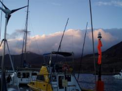 Nous nous attendions à un système d'amarrage par pendilles, que le captain exècre; heureuse surprise, des pontons tout neufs avec catways étaient installés et un représentant de la marina nous attendait pour nous aider à accoster, ce qui ne fut pas de trop car le coup de vent annoncé pour le soir avait pris de l'avance et avait commencé à souffler alors que nous étions encore à 5 milles de l'arrivée. A peine étions-nous amarrés que nous enregistrions 38 nœuds de vent dans la marina.