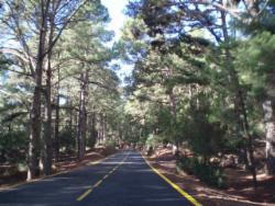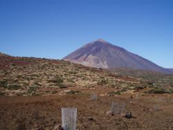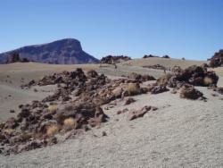 Une soixantaine de kilomètres de montée par la route de crêtes en venant de l'est fut nécessaire pour atteindre le pied du mont à 2350 m environ; jusqu'à 1900 mètres, nous traversâmes de magnifiques forêts de pins, merveilleusement entretenues, puis, sans transition, au détour d'un virage nous faisant changer de versant, il n'y avait plus de végétation! Ou plutôt il n'y avait plus qu'une végétation rase adaptée aux rudes conditions climatiques de l'endroit, puisque les températures peuvent y atteindre 36° le jour et -16° la nuit, et au manque de fertilité du sol. Cette végétation fleurit essentiellement au printemps, si bien que nous n'en aurons pas vu le côté le plus spectaculaire; elle est essentiellement composée de cytises jaunes des cimes, de genêts blancs du Teide, de vépérines rouges et bleues, de giroflées du Teide et, en haute altitude près du cratère, la violette du Teide.