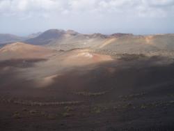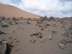 Nous nous dirigeâmes ensuite vers le clou de nos visites, le parc national de Timanfaya. Il ne protège aucune espèce animale ou végétale, mais un trésor minéral en activité : c'est un ensemble de cônes volcaniques très anciens, mais qui entrèrent en éruption au cours des 18ème et 19ème siècles, anéantissant la région la plus fertile de l'île. Outre ces cônes volcaniques, on y voit les mers de lave, les bombes (gros rochers expulsés par les