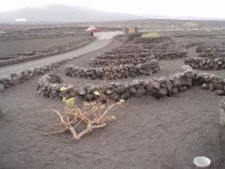 Puis nous nous dirigeâmes vers La Geria, le centre viticole de l'île; nos vignerons bordelais ou bourguignons seraient bien étonnés de voir la façon dont est cultivée la vigne, au beau milieu des cendres volcaniques, chaque pied étant planté au centre d'un mini cratère de cendre entouré de pierre de lave pour maintenir, autant que faire se peut, le peu de rosée qui s'y dépose la nuit en guise de seul arrosage! Inutile de dire que les pieds de vigne sont un peu rabougris, mais ils donnent cependant assez de raisin pour produire des vins rouges, rosés ou blanc, vendus d'ailleurs assez chers.