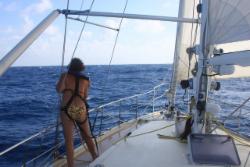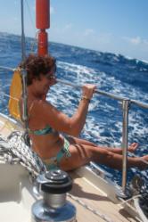Pendant ce temps, le mousse du bord vaque à ses occupations: bains de pieds pour tester la température de l'eau, prise de photos de dauphins, harnachée comme si nous étions force 10, reprise de coutures du pavillon national; bref, parfaitement à l'aise dans ces conditions de mer, elle apprécie comme tout l'équipage cette traversée qui allait être bien plus courte que prévu.