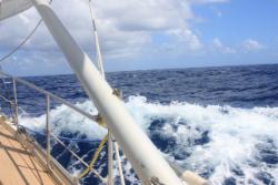 Le 24 mai, l'alizé d'est forcira force 5, puis montera progressivement les jours suivants à force 6 puis 7 en s'orientant est sud-est. L'allure se stabilise autour du petit largue avec tout dehors : génois, grand-voile, artimon et foc d'artimon, sauf par vent d'Est où nous rentrons tout pour envoyer génois et ballooner tangonnés.