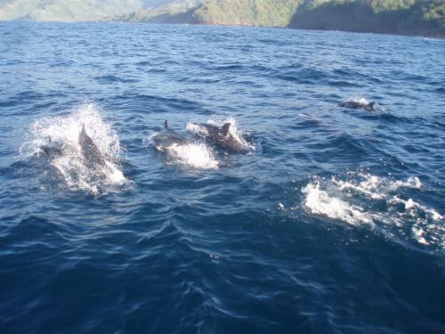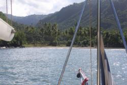 Finalement, l'approche de l'île Hiva Oa se fera avant le lever du jour; pas une lumière, pas un phare, pas la moindre lueur pour indiquer la présence de cette terre après 3000 milles de mer par une nuit sans lune; à peine devinera-t-on une masse noire que nous longerons jusqu'à la baie de la petite ville d'Atuona, "capitale" de l'île, que nous atteindrons au lever du jour, accompagnés d'un banc de dauphins nous montrant le chemin.