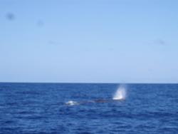 Le lendemain du départ, vers midi, premiers événements de la traversée : le captain à la barre aperçoit une énorme tache brune à une centaine de mètre juste devant le bateau. Aucun doute possible, il s'agit d'une énorme baleine et nous fonçons droit dessus! Avant de partir, nous avions lu avec Maryse deux livres contant l'histoire de deux naufrages de bateau, précisément à cet endroit, suite à des collisions avec ces cétacés! Vite le temps de débrancher le pilote automatique et d'obliquer 30° sur bâbord et deux baleines passent à 20 mètres sur tribord, sans avoir apparemment bougé. L'équipage était partagé entre l'émerveillement du spectacle et la crainte qu'un tel événement puisse se répéter de nuit sans visibilité…